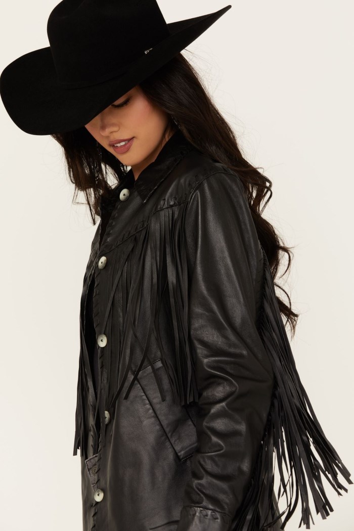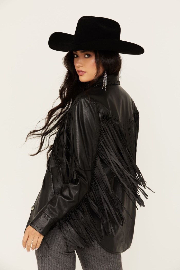 - Solid black design with fringe and buck stitch accents on front, back and sleeves