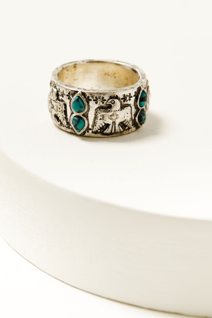 - Ring 5: Silver-toned band with thunderbird design and turquoise-toned accents