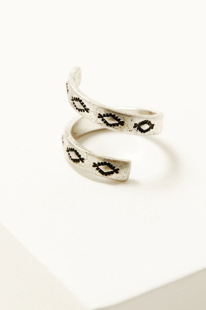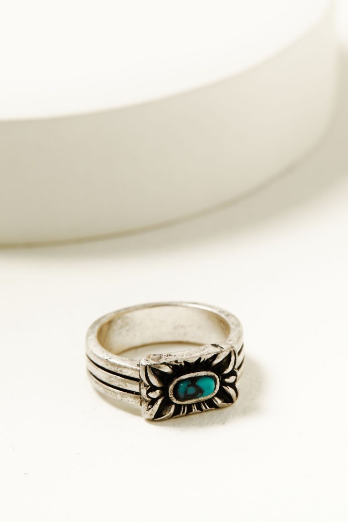 - Ring 4: Silver-toned band with rectangle concho pendant and turquoise-toned stone center