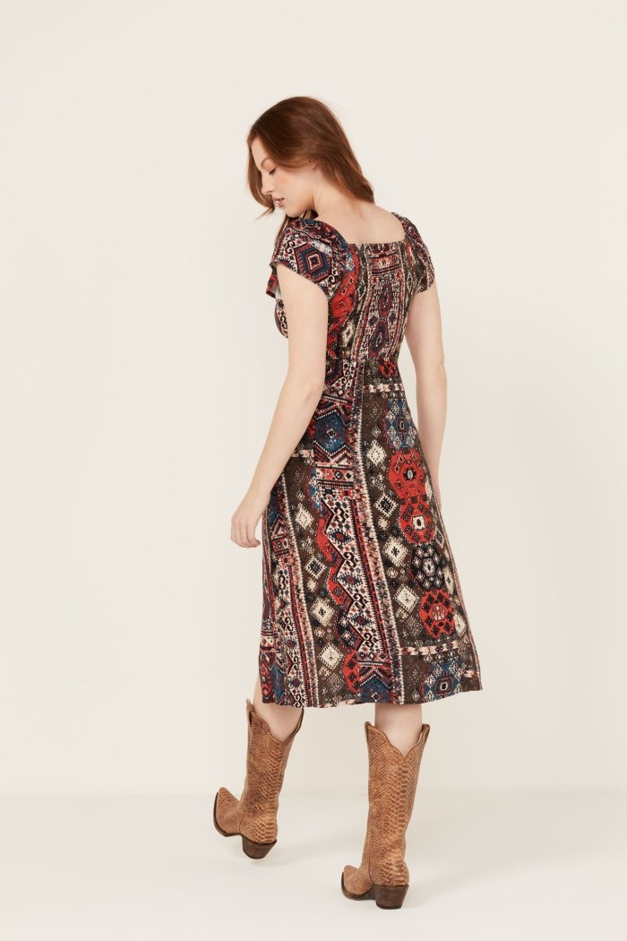 - Multicolored print throughout
