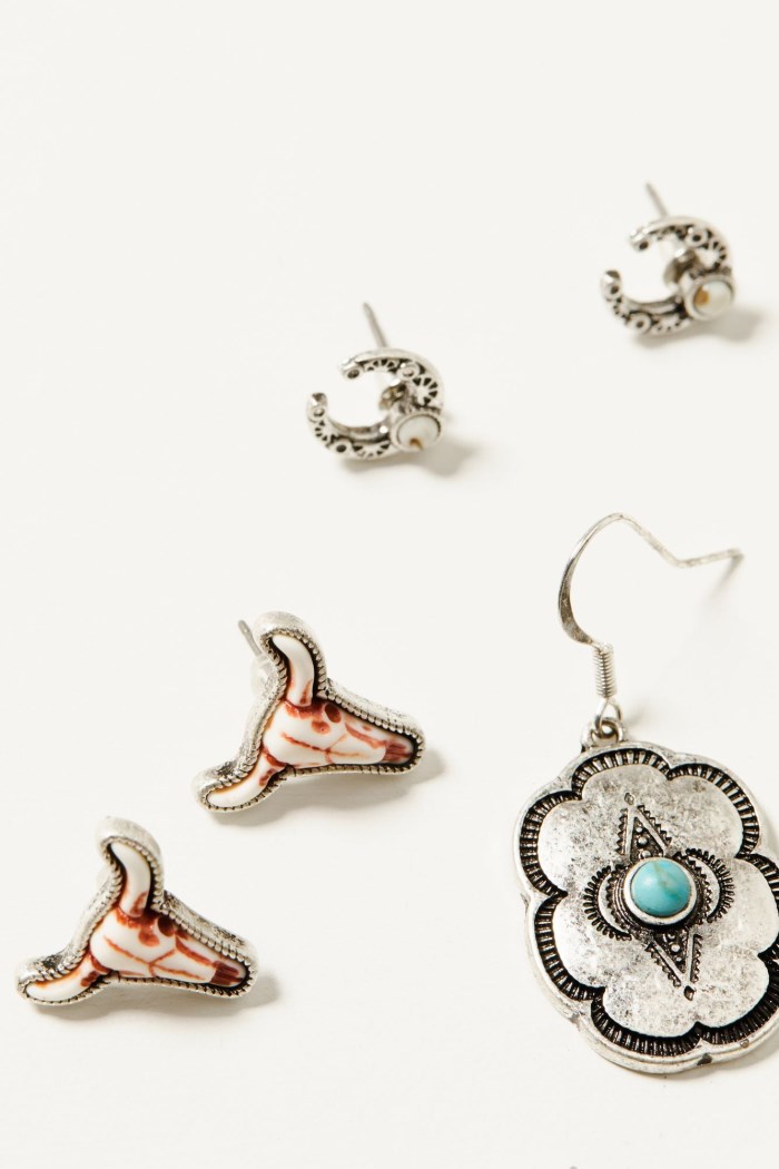 - Earring 3: Silver-toned steerhead studs with painted details and stone centers