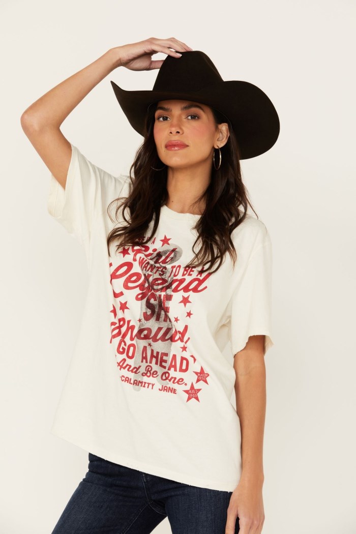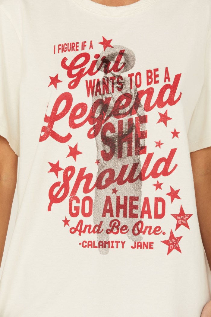 - Calamity Jane graphic on front with "I Figure If A Girl Wants to be A Legend She Should Go Ahead and Be One"