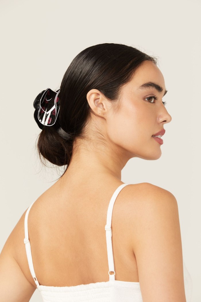 - Clip 1: Black with with red rose print throughout
