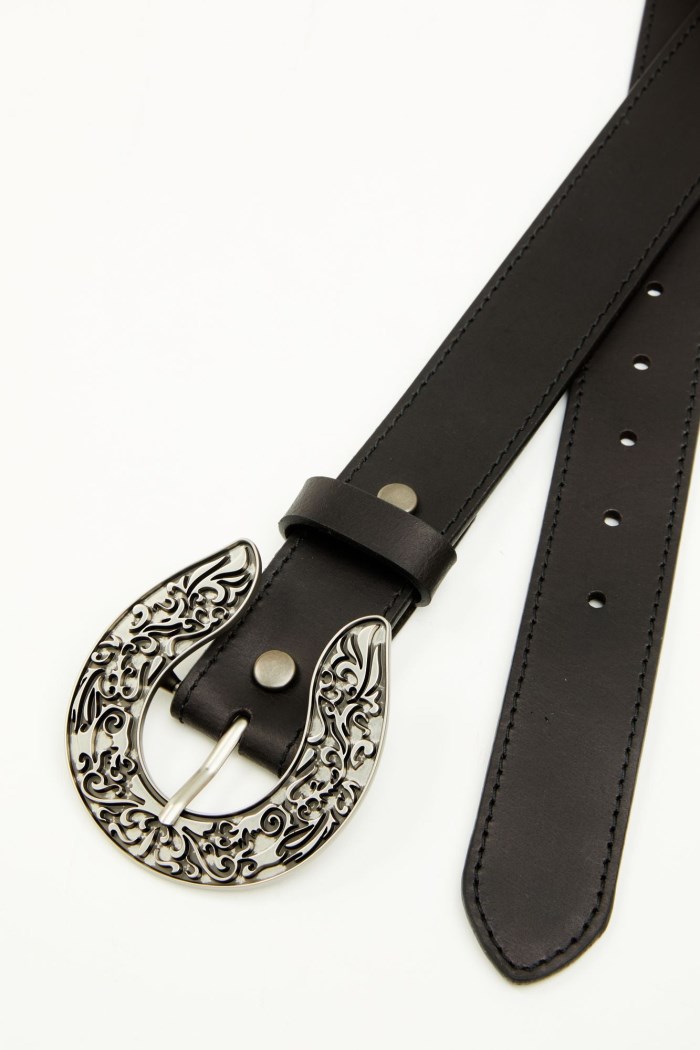 - Silver-toned horseshoe buckle with filigree embossed design