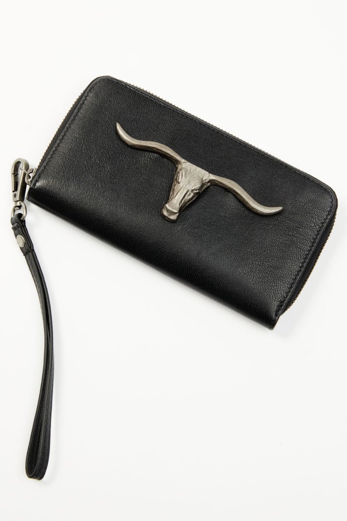 - Solid black with silver-toned longhorn motif on front