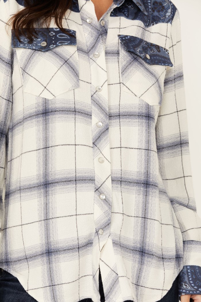 - Blue paisley print faux suede fabrication on yokes, pocket flaps and cuffs