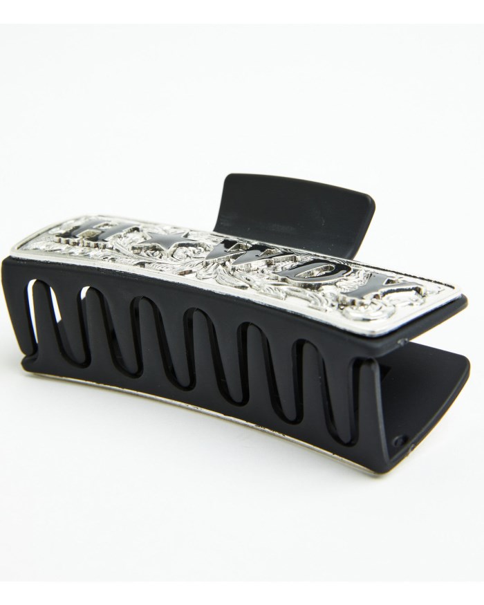 - Silver-toned filigree etched metal design with "Howdy" and black painted details