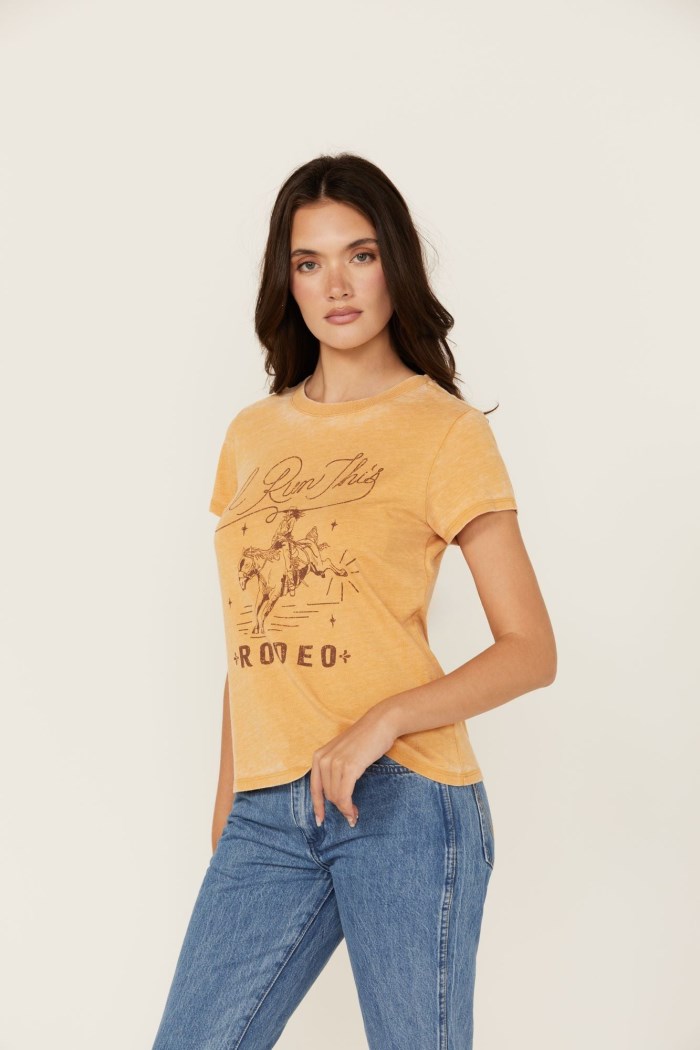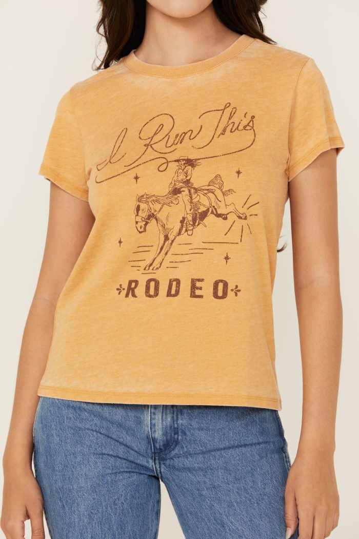 - Cowgirl graphic on front with " I Run This Rodeo"