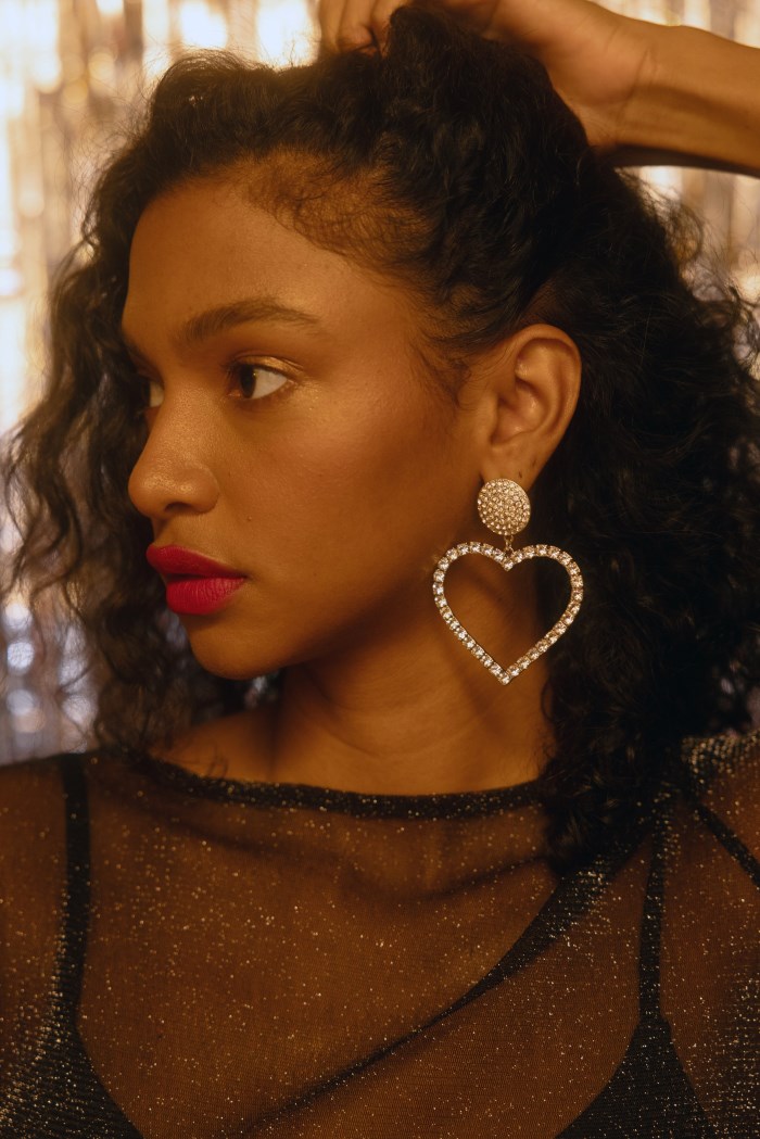 - Rhinestone circle stud with dangling rhinestone heart