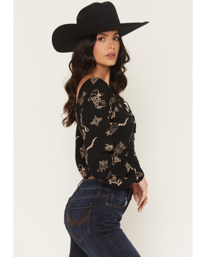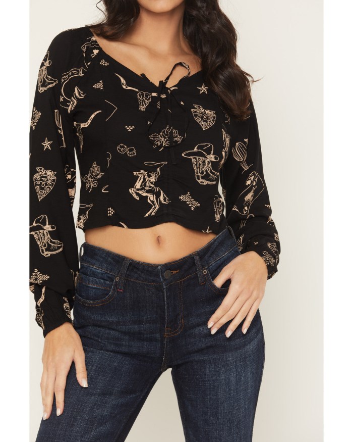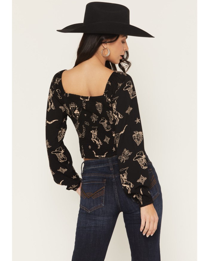 - Black with allover tan western conversational print