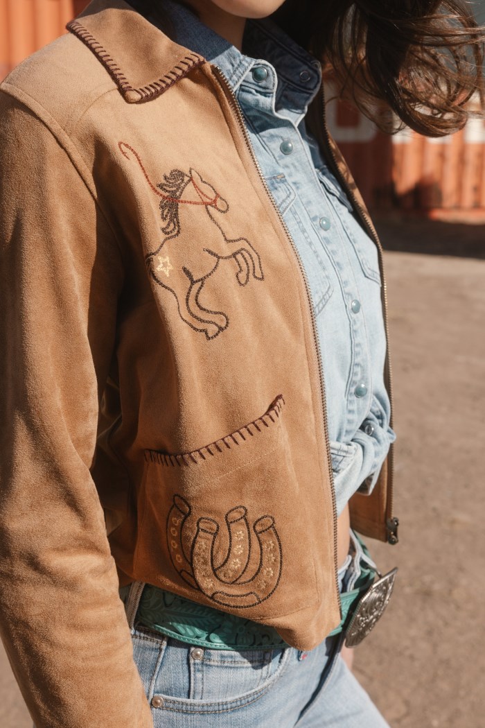 - Dark brown whip stitch accents on collar, cuffs, and pockets