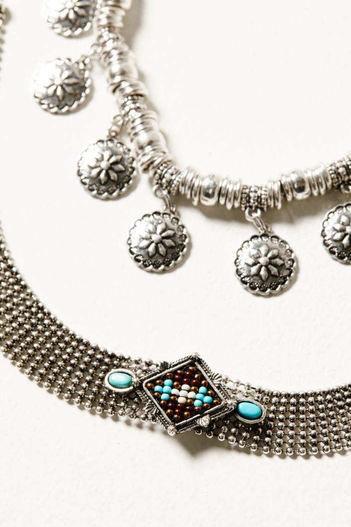 - Piece 1: Silver-toned charm necklace with dangling conchos