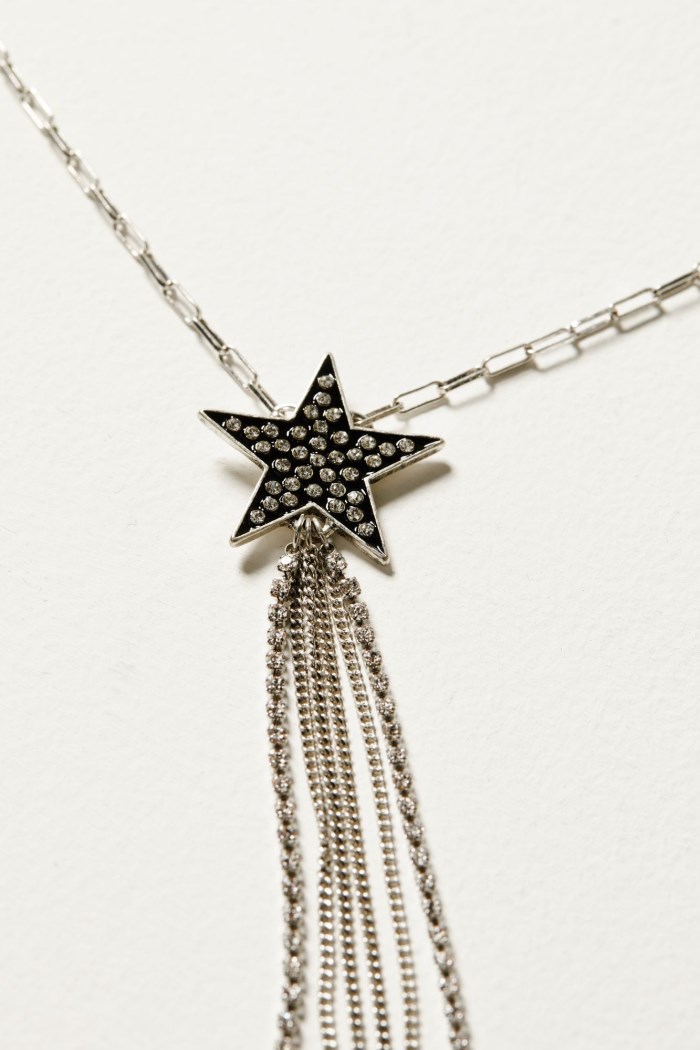 - Black painted star pendant with clear crystal accents and dangling fringe