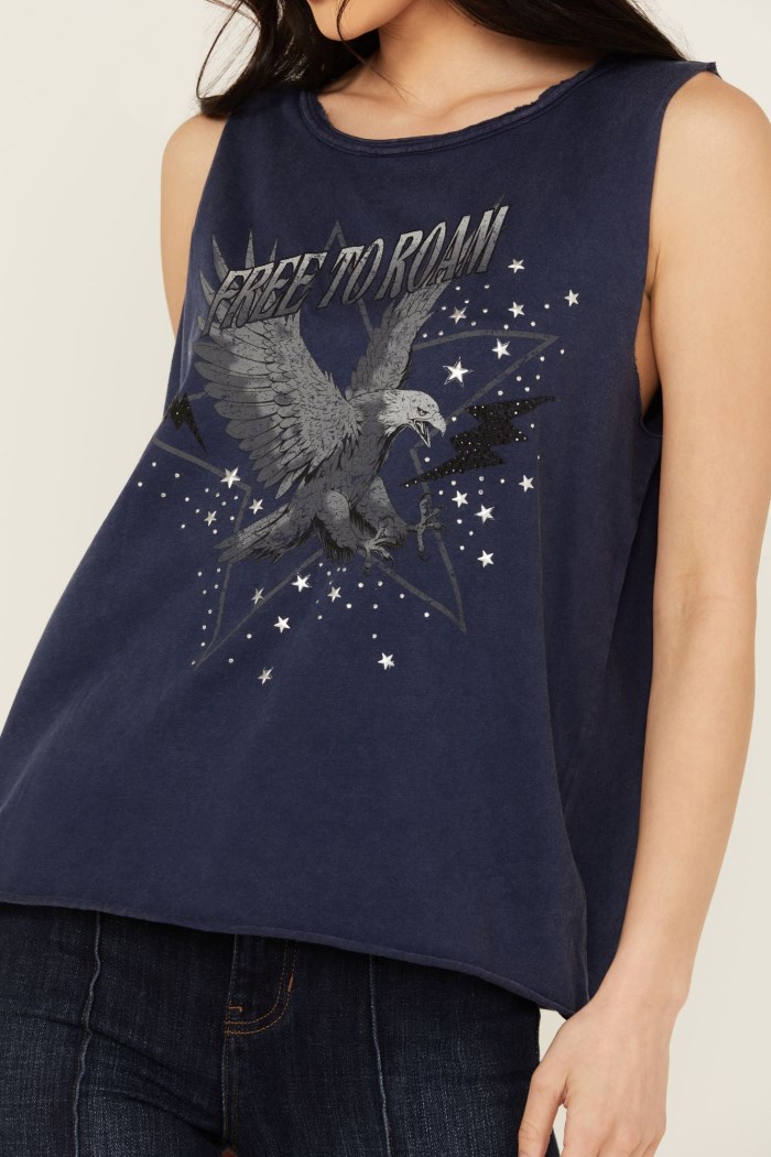 - Eagle, star and lightning bolt graphic on front with "Free to Roam" and rhinestone accents