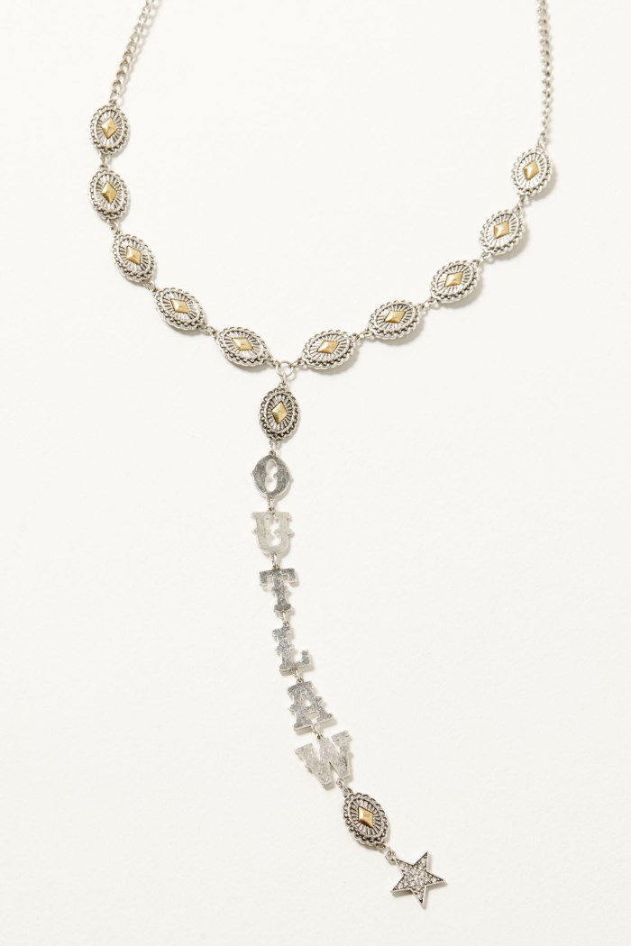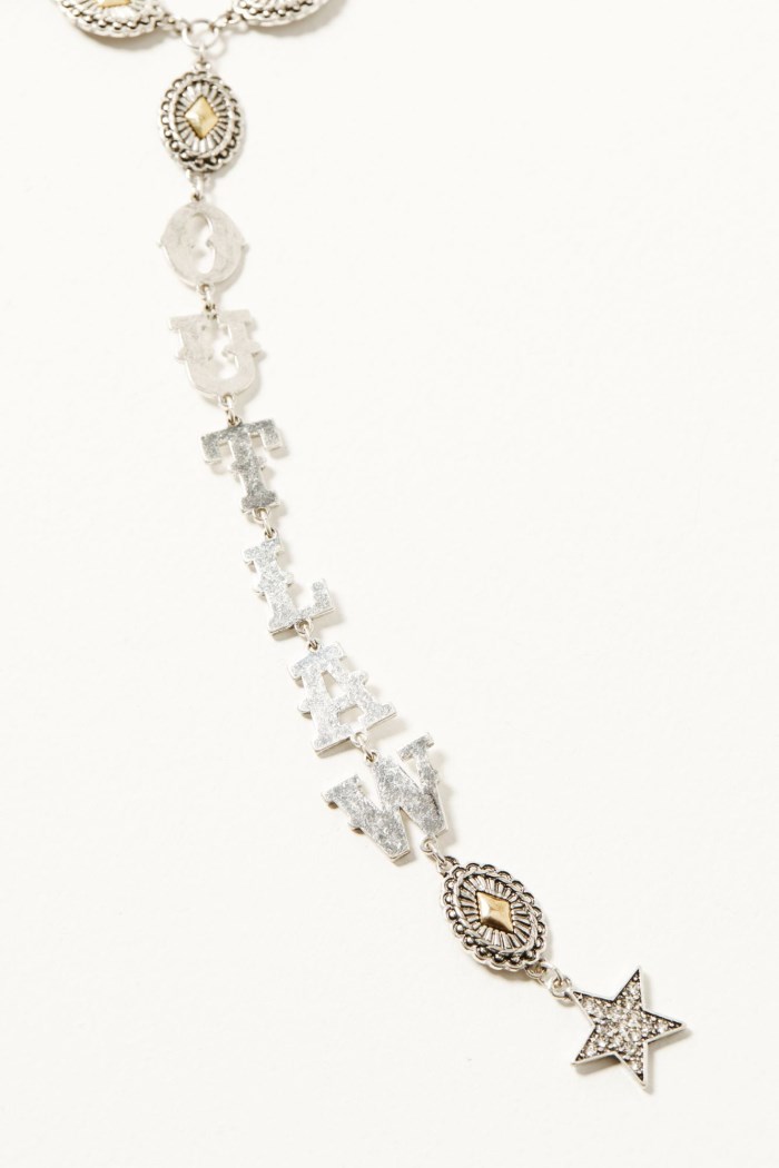 - Silver and gold concho chain link with Dangling "Outlaw" with rhinestone star accents