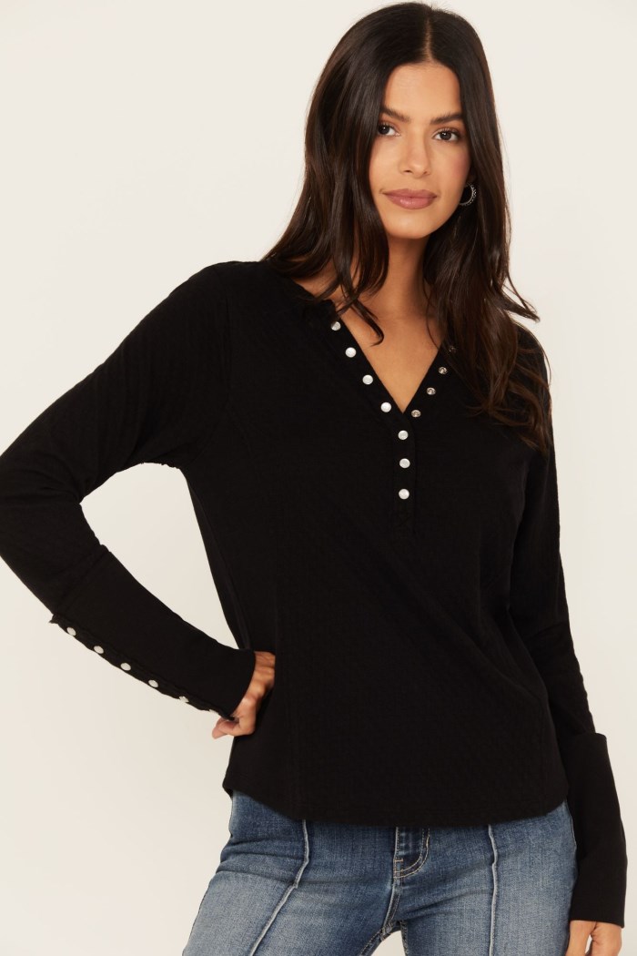 - Pearl snap Henley placket