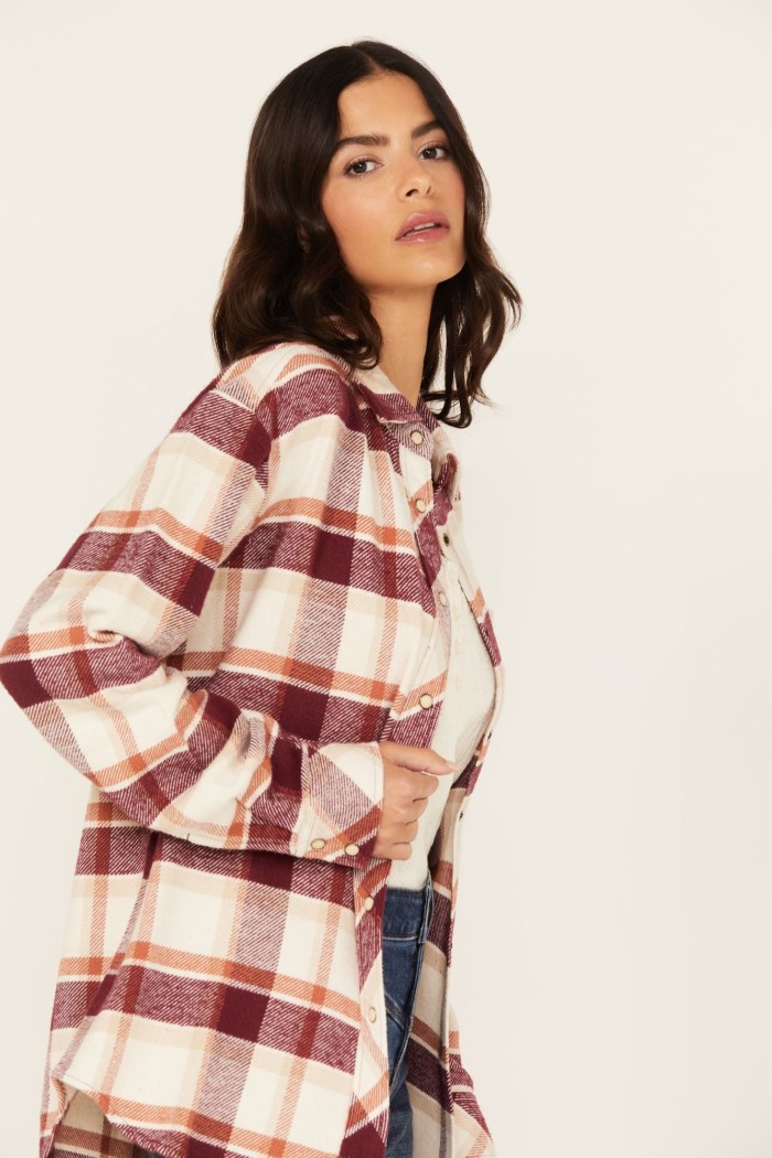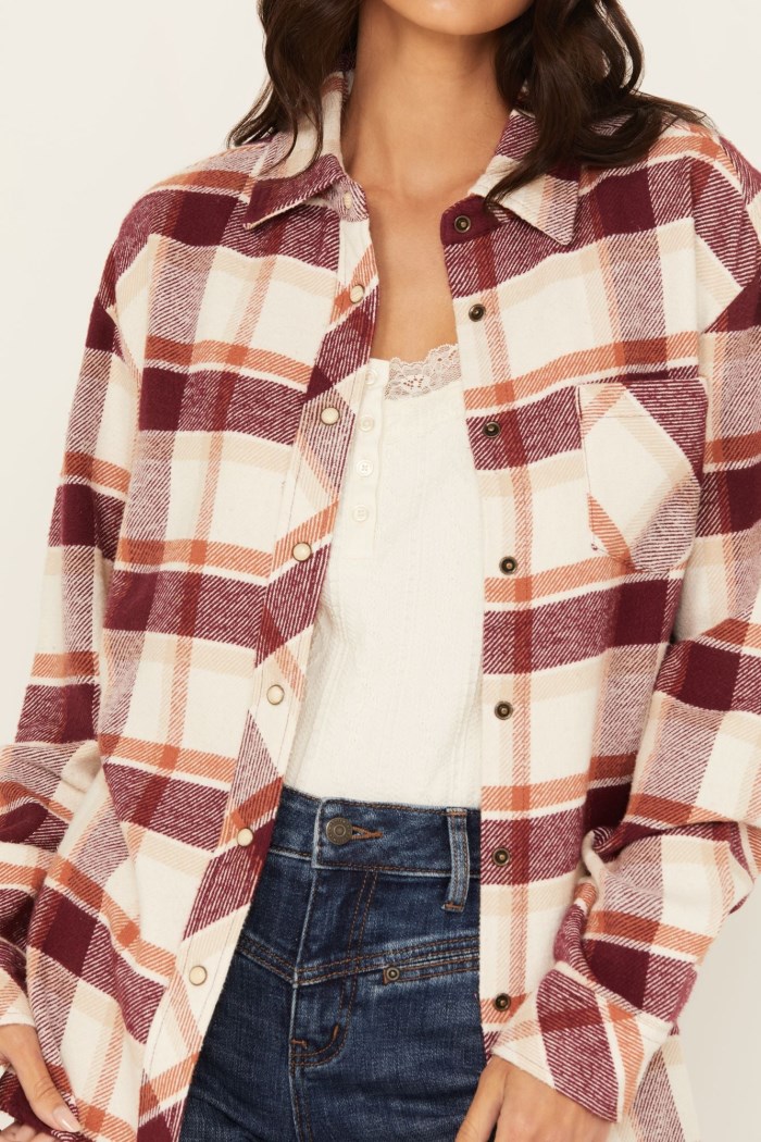 - Cream with tan, burgundy and orange plaid print