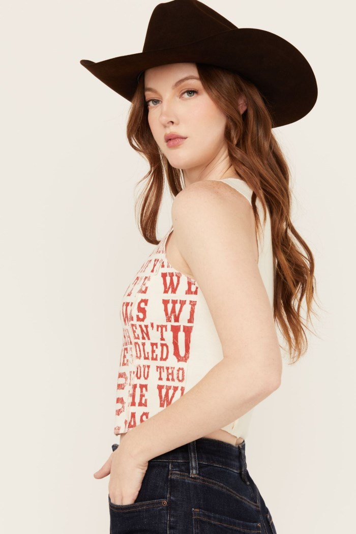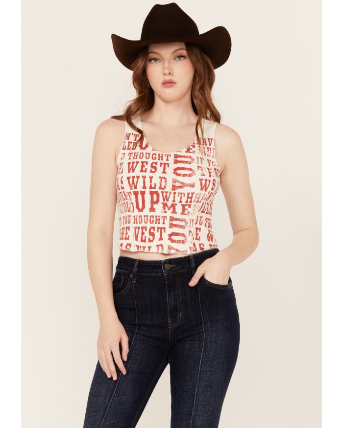 - Ivory with red vintage "Wild West" conversation word print on front