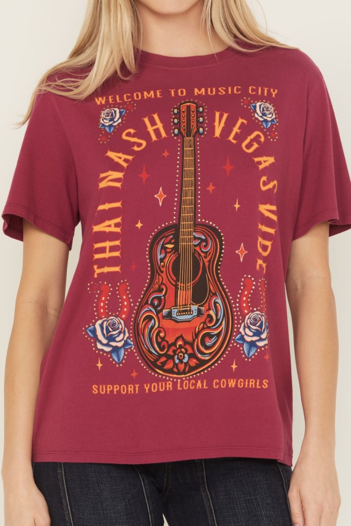 - Guitar and floral horseshoe graphic on front with "Welcome To Music City / That Nash Vegas Vibe / Support Your Local Cowgirls"