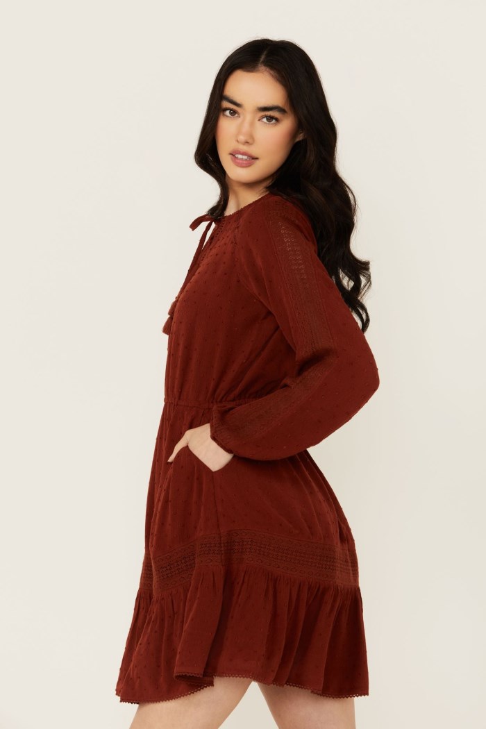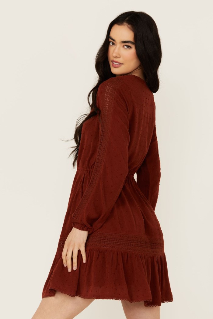 - Lace inset panels on sleeves and skirt and ladder lace inset panels on neckline and shoulders