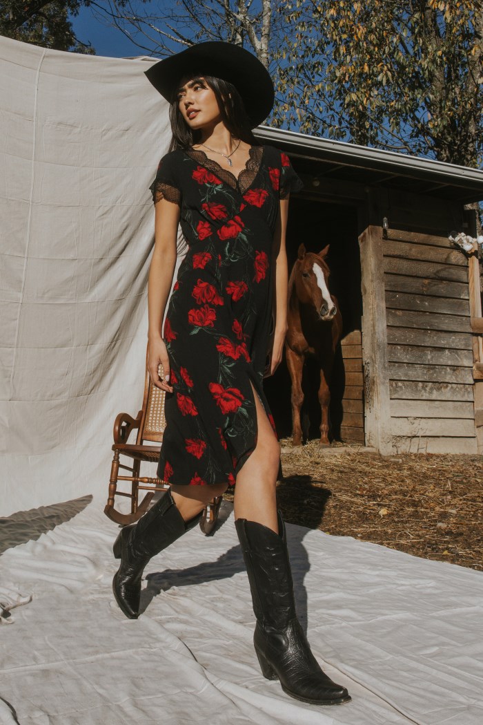 - Black with red rose print throughout