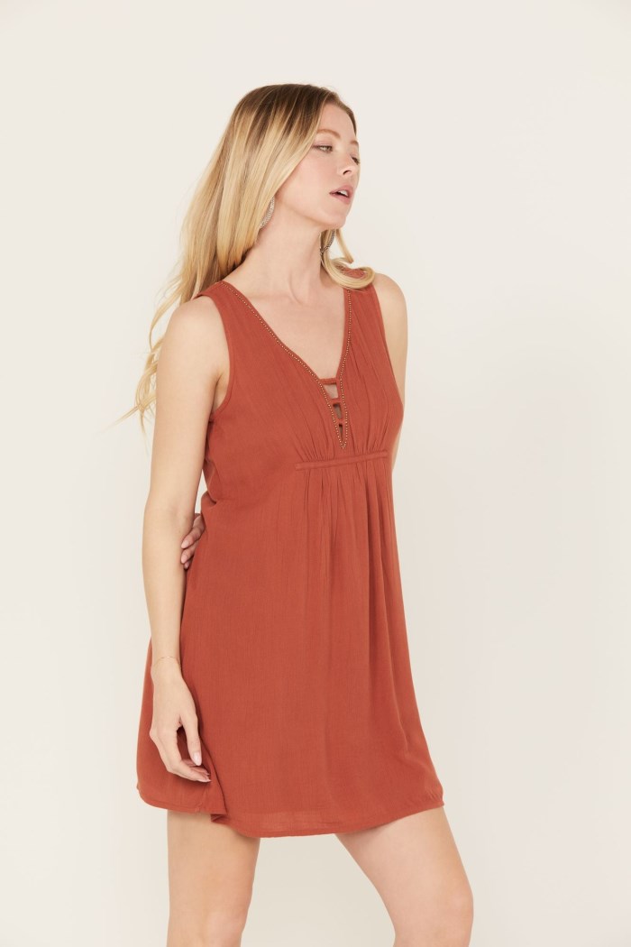 - Deep V neckline with braided ladder design