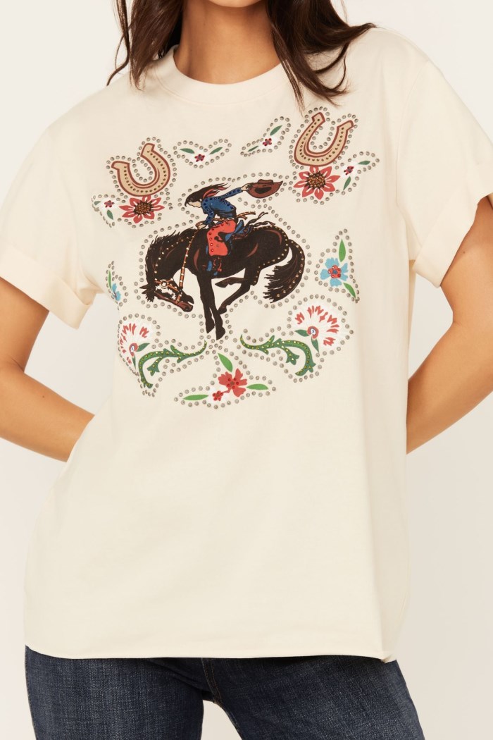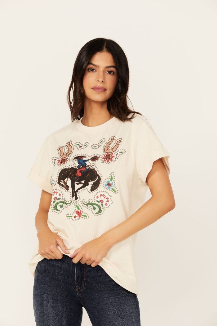 - Cowgirl, horseshoe, and floral graphic print
