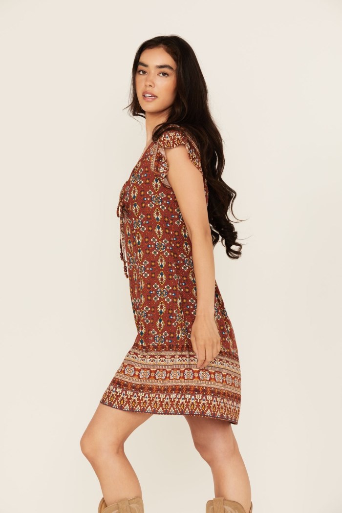 - Multicolored tapestry print throughout
