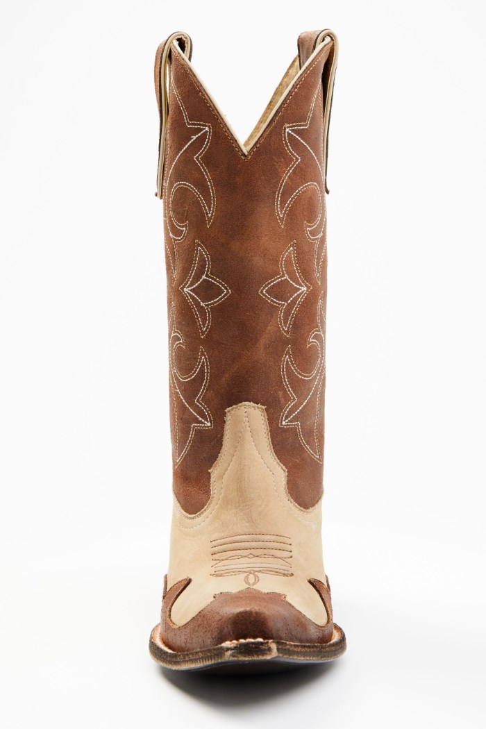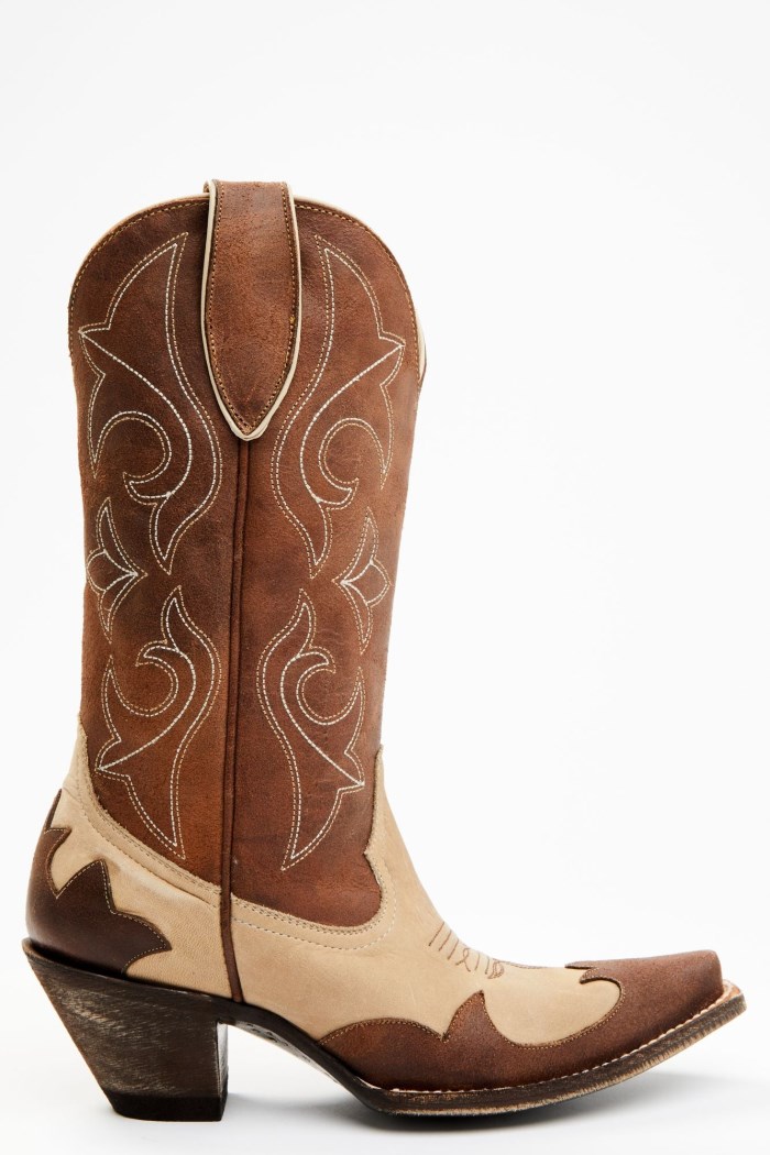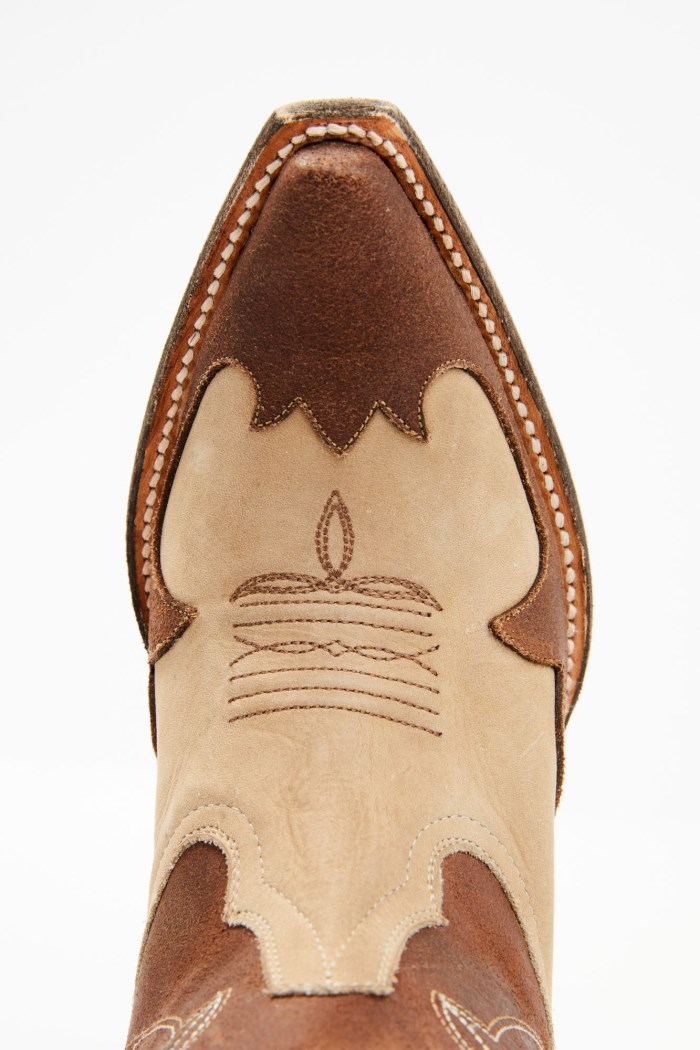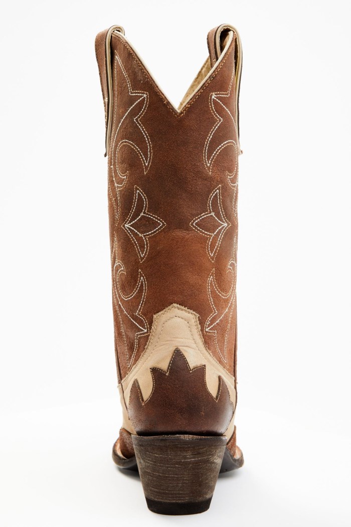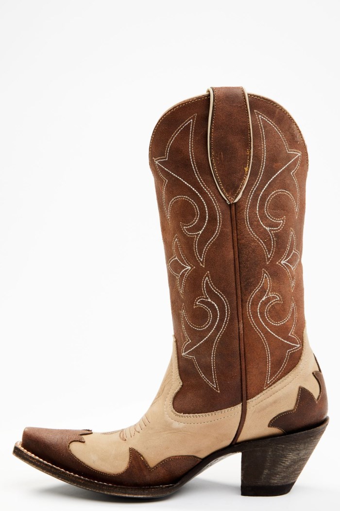 - Tan vamp with brown shaft and brown overlay design