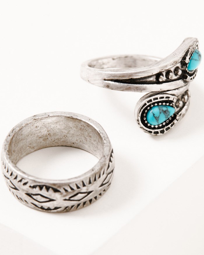 - Ring 5: Silver-toned band with painted details and turquoise toned stone accents