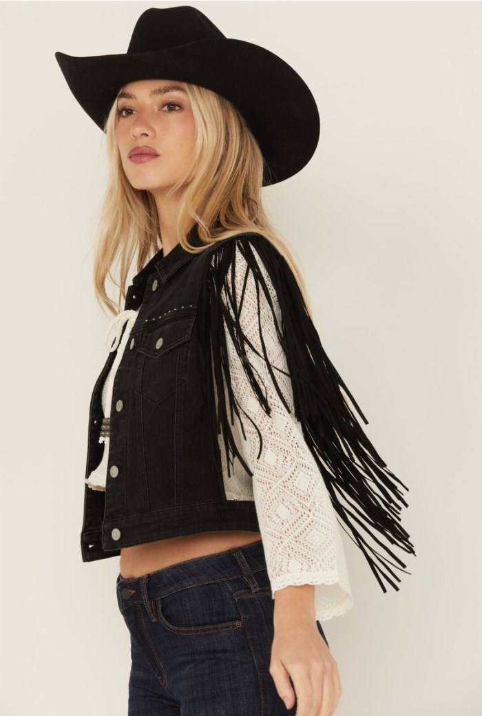 - Black fringe accent at shoulders