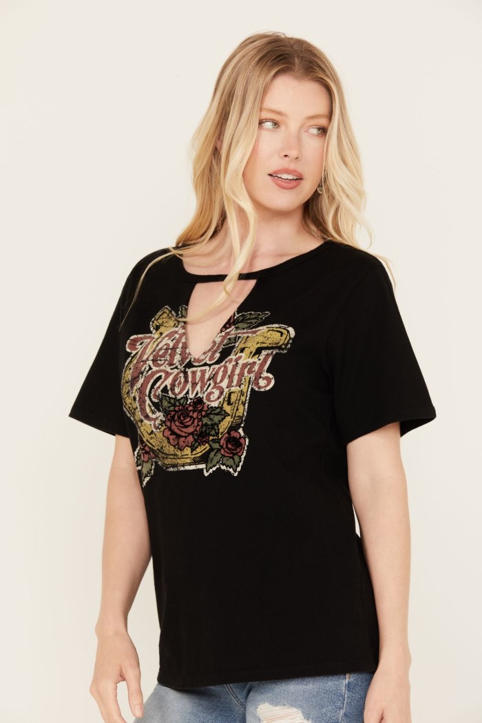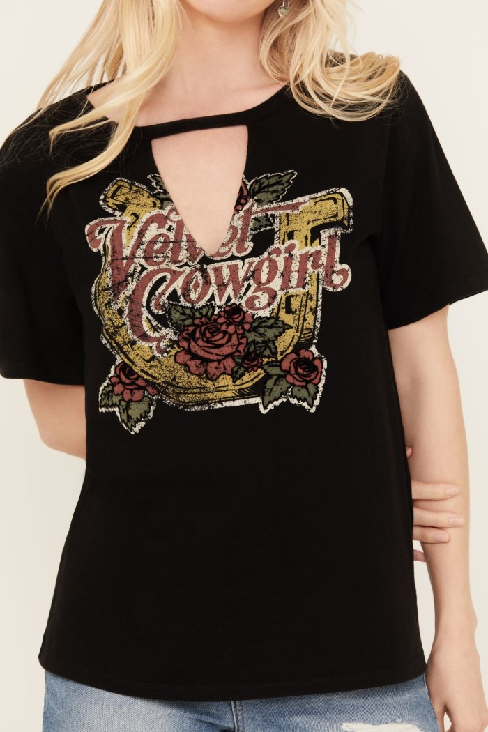 - "Velvet Cowgirl" with horseshoe and rose vintage graphic on front with velvet details