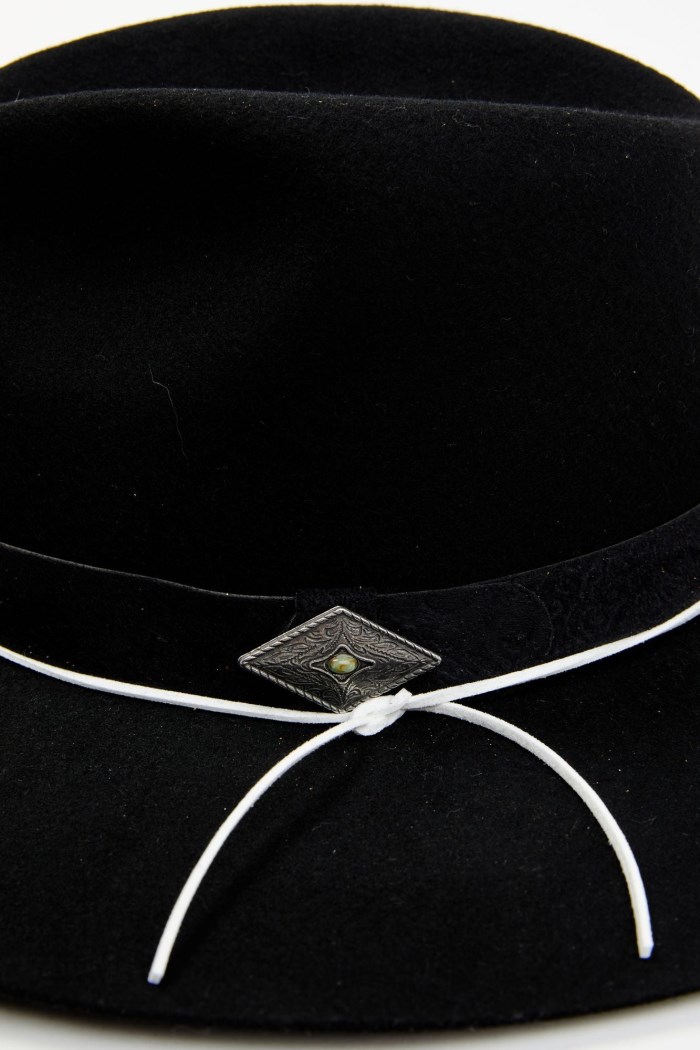 - Matching ribbon hat band with diamond shape concho and white accent tie